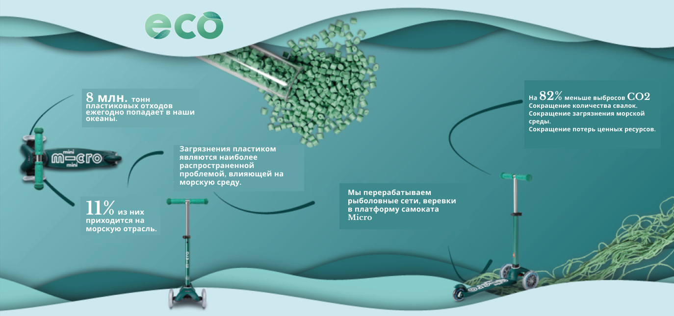 Детский со светящимися колесами от известного швейцарского бренда Micro. Главное преимущество серии ECO— забота об окружающей среде и выбор в пользу более этичного и экологичного производства. Платформа самоката выполнена из переработанного пластика, выловленного из океана и по своему качеству и функционалу соответствует популярной серии Делюкс. Помогает учиться держать баланс и развивает у ребенка координацию движения. Регулируемая высота руля 67-91 см. Maxi Micro Deluxe ECO теперь еще и со светящимися колесами. Из нового и экологичного производственного материала! Выбирая Maxi Micro Deluxe ECO — позаботьтесь о Ваших детях и о Вашей планете!