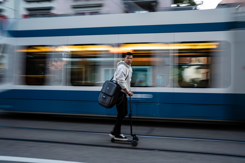 Чемодан также можно отделить от самоката с помощью простого защелкивающегося механизма и при необходимости транспортировать с помощью встроенного плечевого ремня.