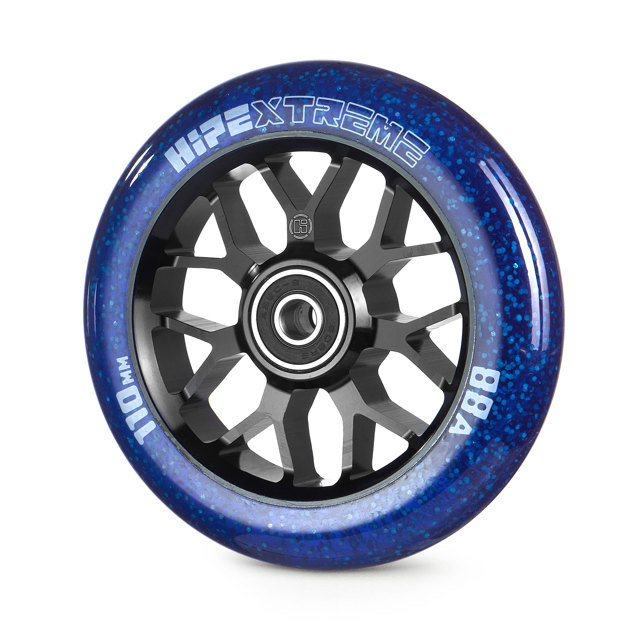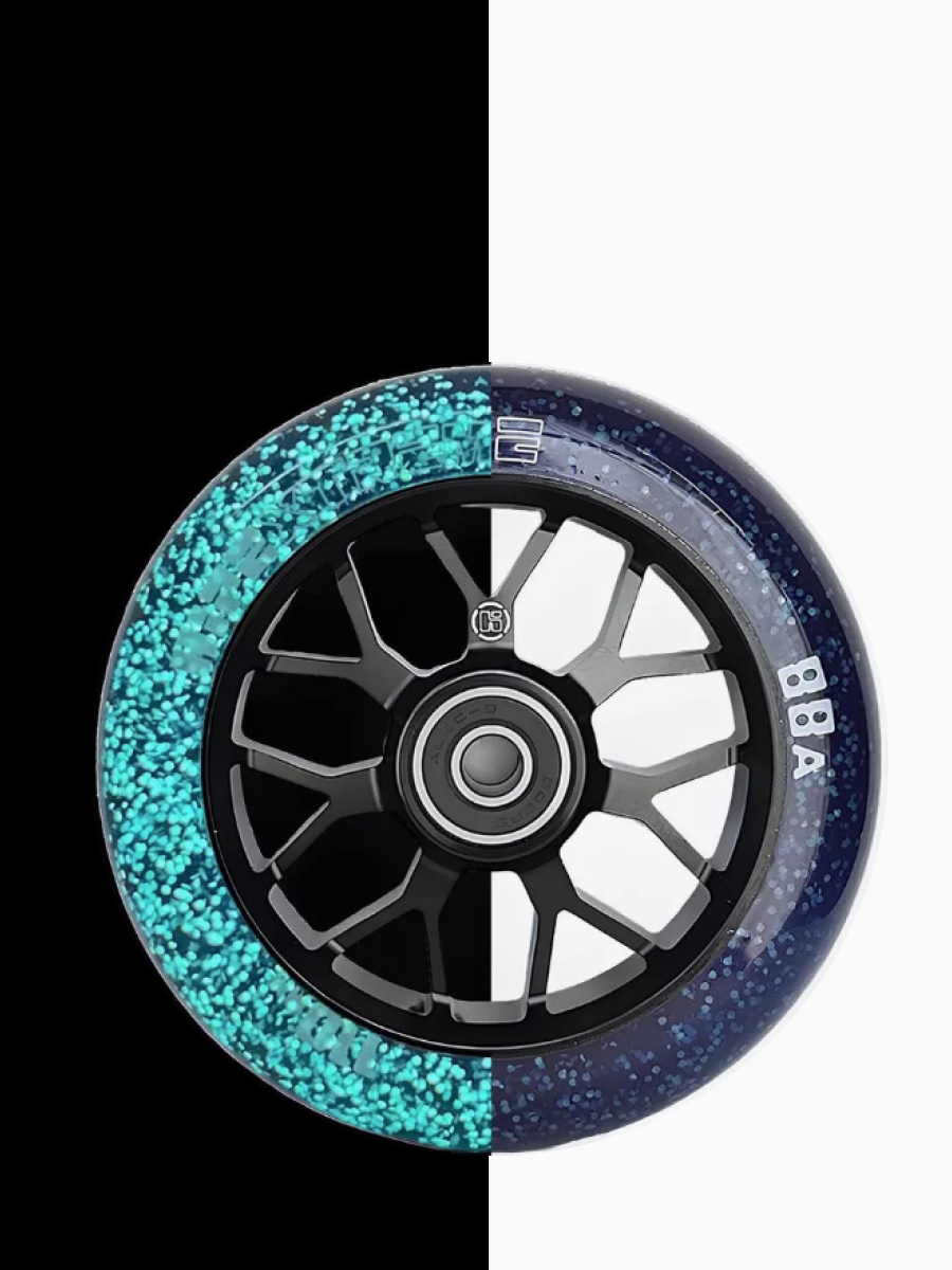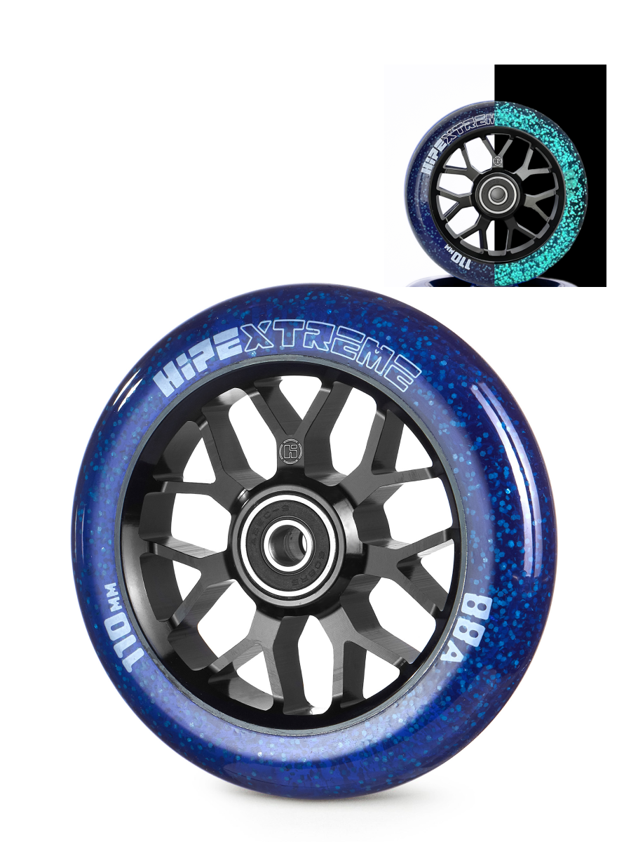 Колесо светящееся для трюкового самоката HIPExtreme Neon Flakes (светится в темноте). Классическое полиуретановое спицевое колесо 110*24 мм. Внутри колеса светонакопительные неоновые хлопья заряжается от УФ ультрафиолетовых лучей. Имеют необычный дизайн в форме звезды. В колесо установлены качественные подшипники ABEC9, которые отлично катят. А гелик (полиуретановая оболочка) с высокой степенью отскока будет отлично гасить удары. Подходят под любые вилки, подходят под хомут и черный руль. Идеально для самоката для мальчиков, девочек и подростков, а так же профессионалов.