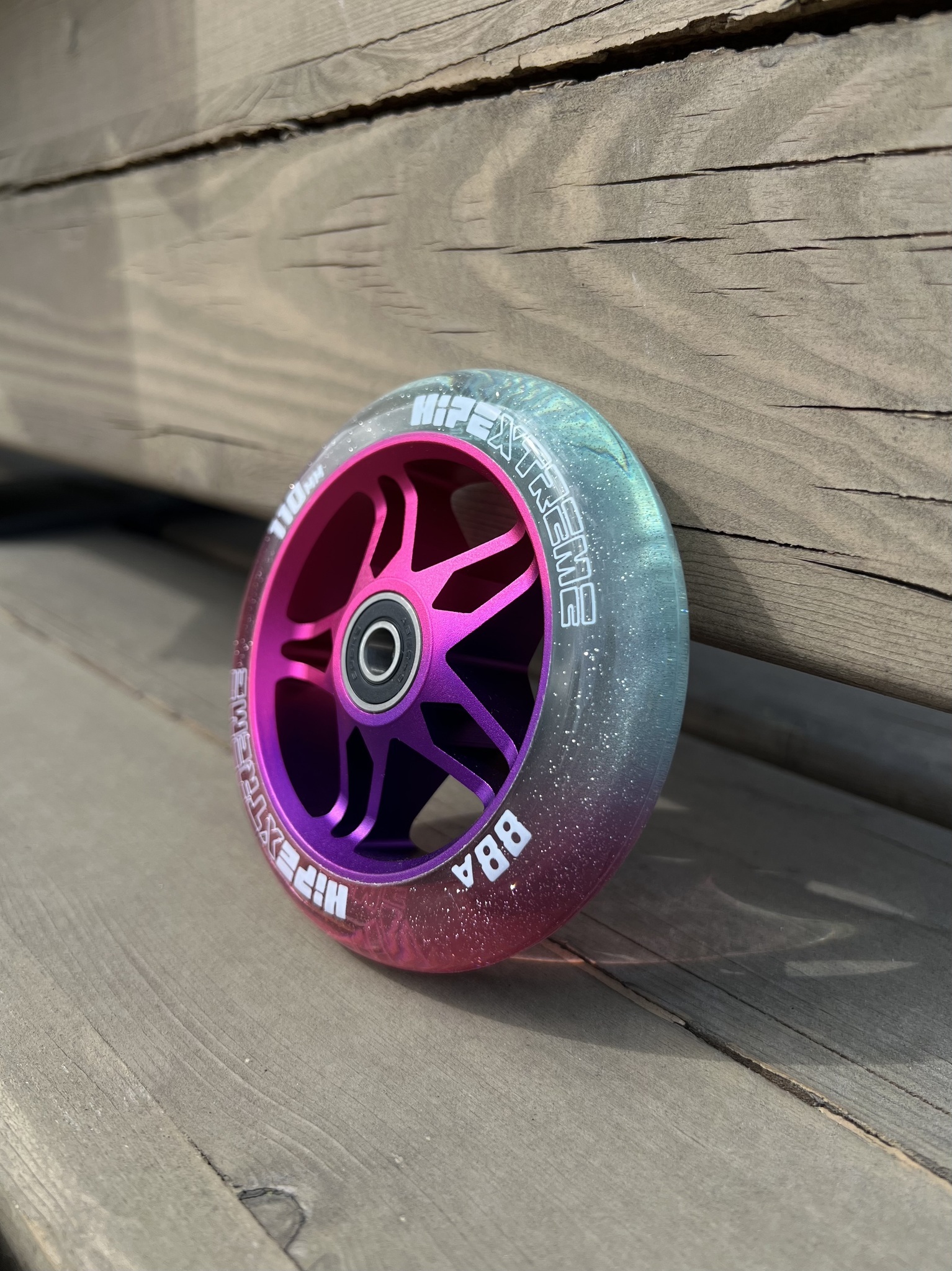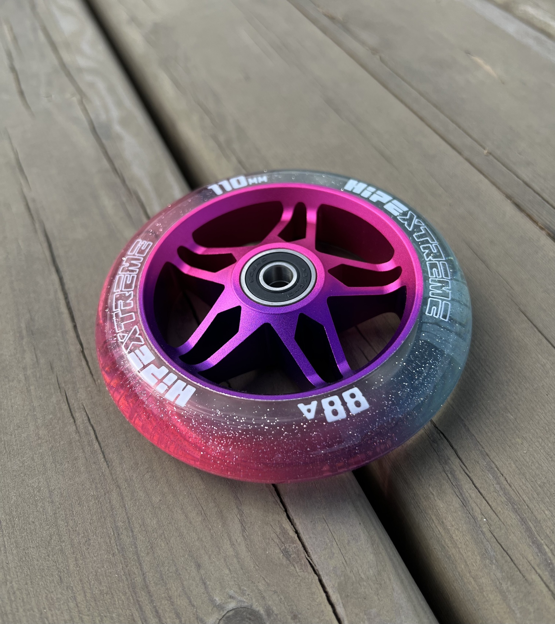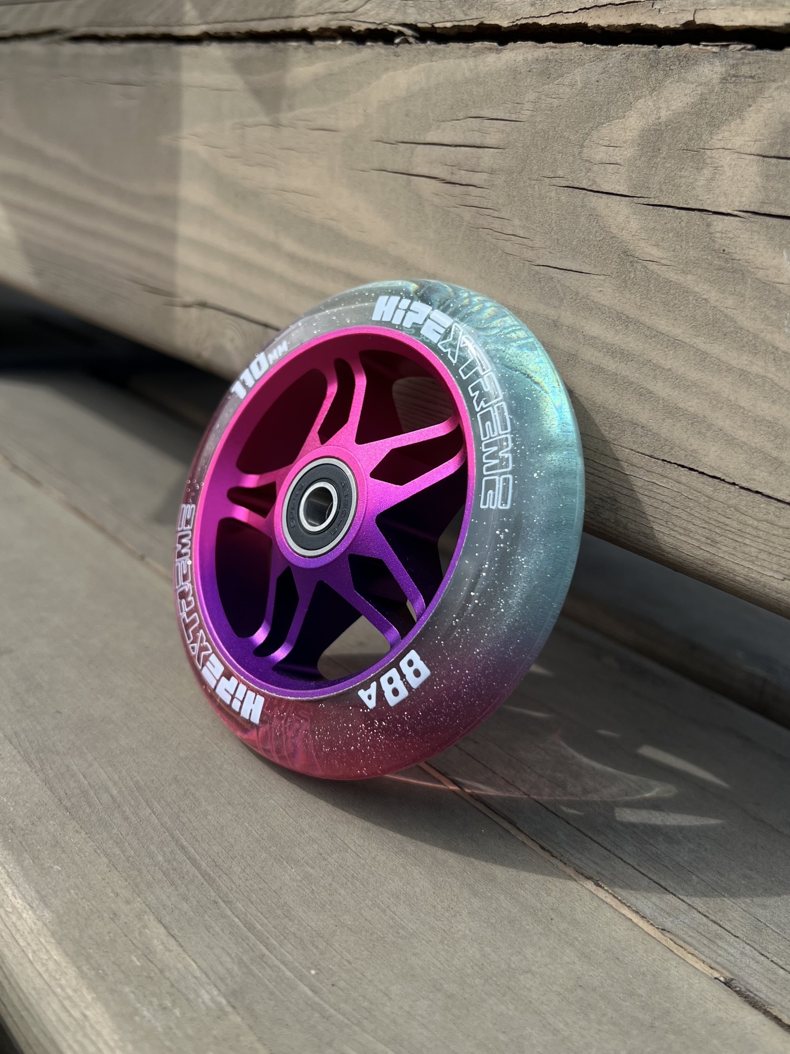 Стильные, легкие и прочные пятиспицевые (5 ти спицевые) колеса от бренда HIPE xtreme, имеют уникальный дизайн в форме звезды. В колесо установлены качественные подшипники ABEC9, которые отлично катят. А гелик (полиуретановая оболочка) с высокой степенью отскока будет отлично гасить удары. Подходят под любые вилки, подходят под хомут и черный руль. Идеально для самоката для мальчиков, девочек и подростков, а так же профессионалов.