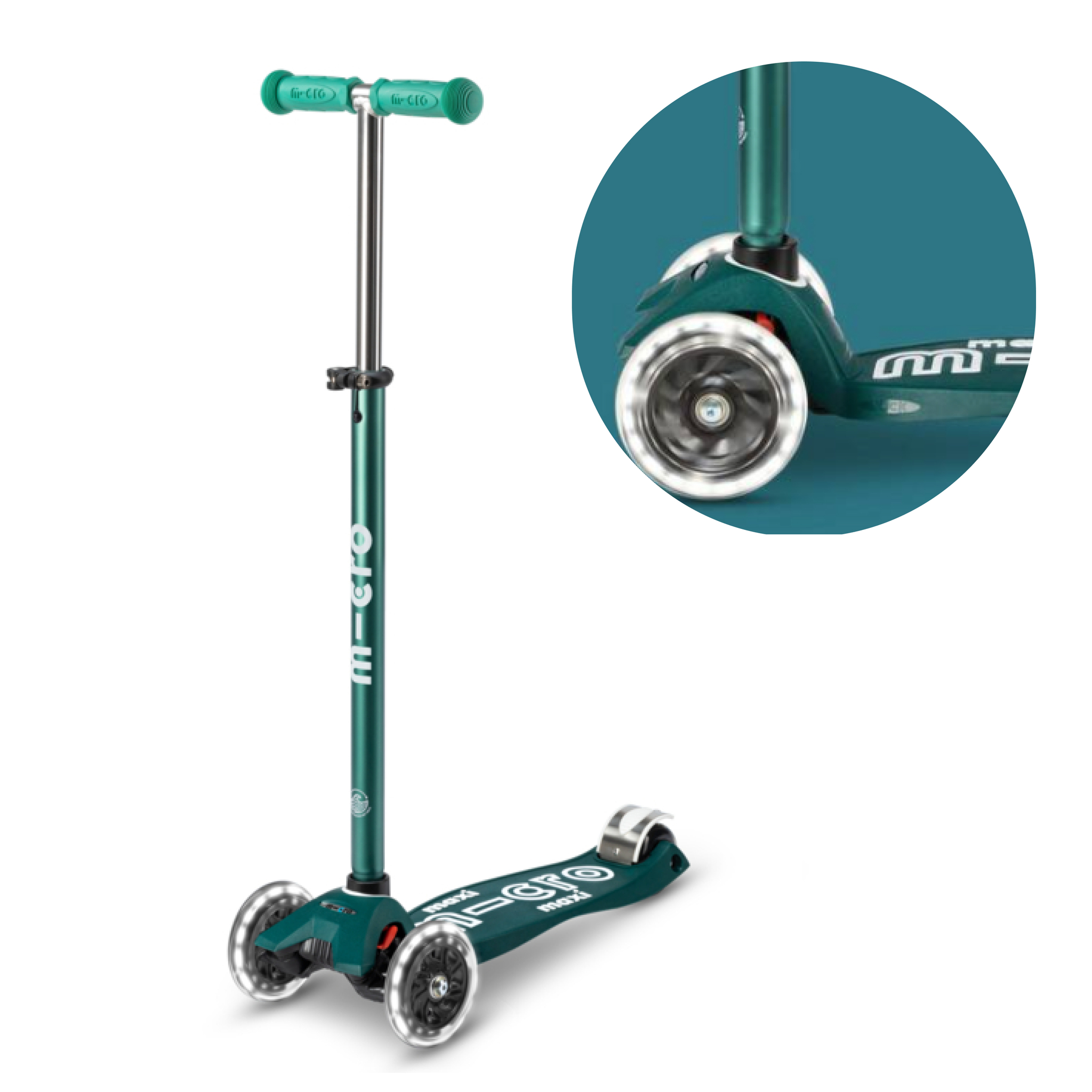 Maxi Micro Deluxe ECO зеленый теперь еще и со светящимися колесами! Самокат, который обеспечивает максимально комфортное и безопасное катание в пасмурные дни и темное время суток. Добавьте яркости ежедневным прогулкам Вашего малыша! Из нового и экологичного производственного материала! Выбирая Maxi Micro Deluxe ECO — позаботьтесь о Ваших детях и о Вашей планете!