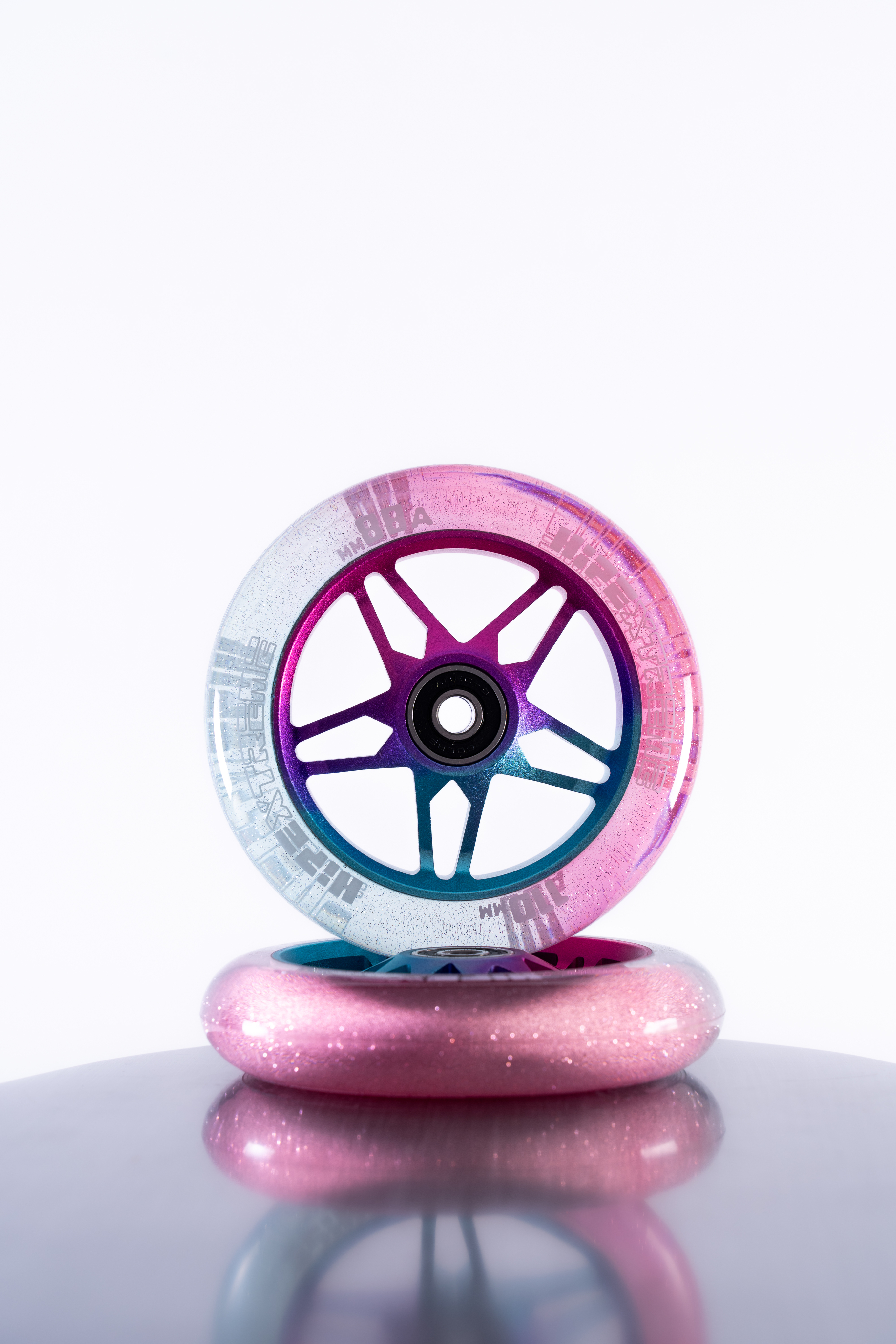 Стильные, легкие и прочные пятиспицевые (5 ти спицевые) колеса от HIPExtreme, имеют уникальный дизайн в форме звезды. В колесо установлены качественные подшипники ABEC9, которые отлично катят. А гелик (полиуретановая оболочка) двухцветный прозрачный, с высокой степенью отскока будет отлично гасить удары. Подходят под любые вилки, подходят под хомут и черный руль. Идеально для самоката для мальчиков, девочек и подростков, а так же профессионалов.