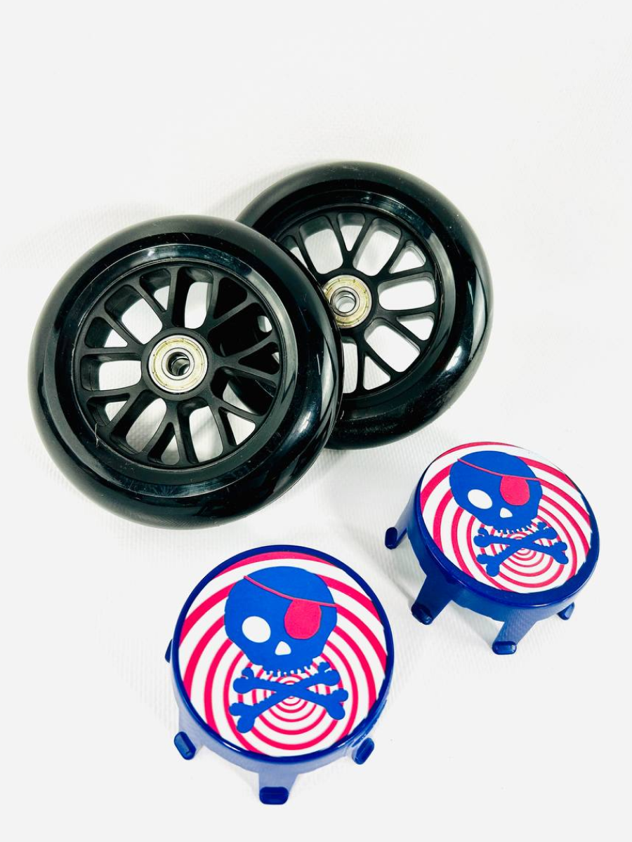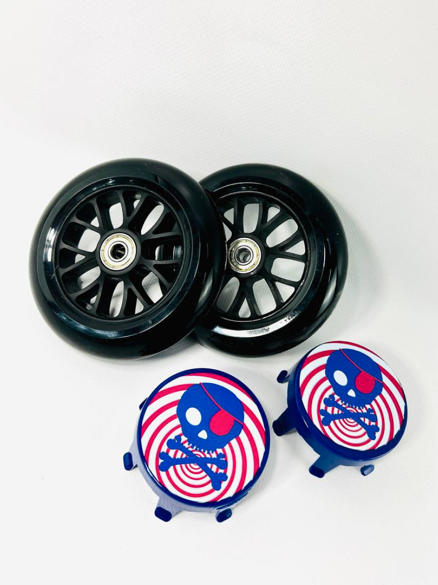 Набор колес в сборе в блистере - AC5006B - для самокатов Bullet, Maxi Micro, Sprite Deluxe и кикбордов Compact + Накладки на колёса для Mini и Maxi Пираты от известного швейцарского бренда Micro.