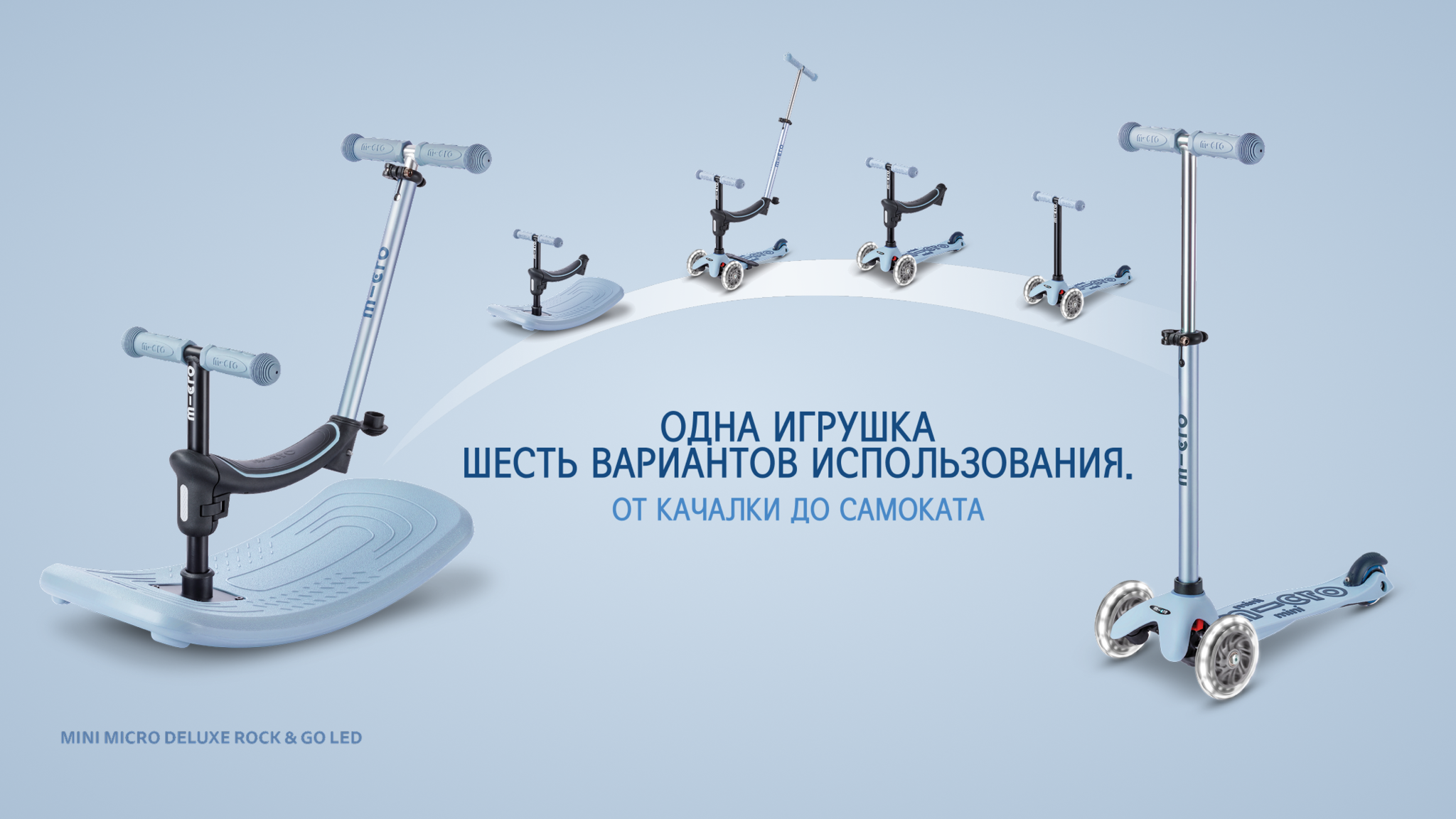Детский самокат-качалка 6 в 1 Mini Micro Deluxe Rock & Go LED от известного швейцарского бренда Micro.