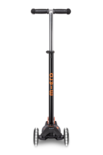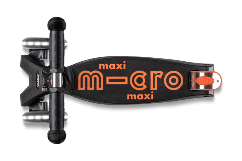 Самокат Maxi Micro Deluxe черно-оранжевый со светящимися колёсами обеспечивает дополнительную безопасность в пасмурные дни и темное время суток. Добавьте яркости ежедневным прогулкам Вашего ребенка!