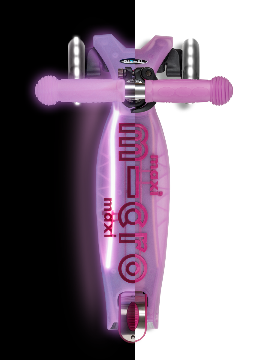 Детский трехколесный самокат Maxi Deluxe Glow Plus LED яркий сиреневый со светящимися колёсами от известного швейцарского бренда Micro.