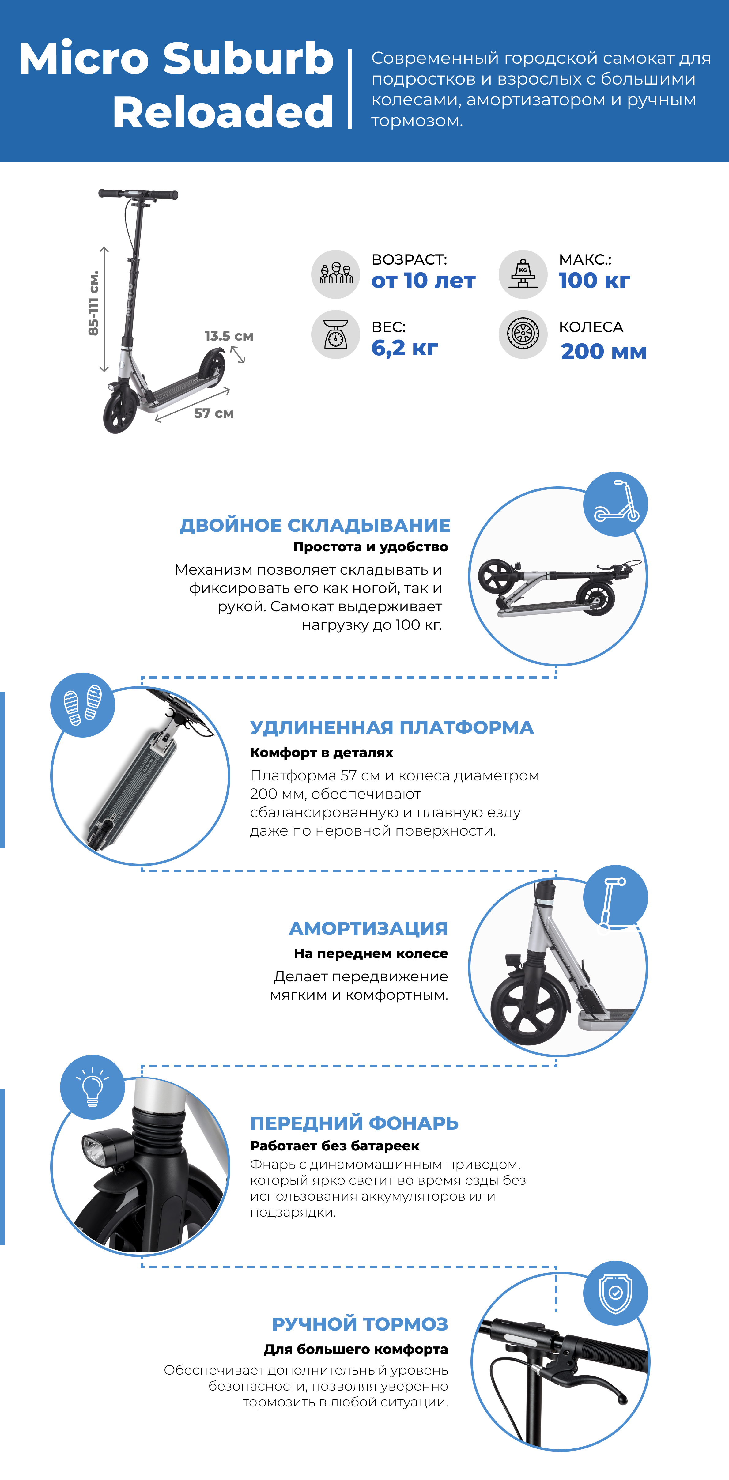 Складные ручки делают самокат более компактным при хранении или транспортировке. Встроенный ручной тормоз обеспечивает дополнительный уровень безопасности, позволяя уверенно тормозить в любой ситуации.