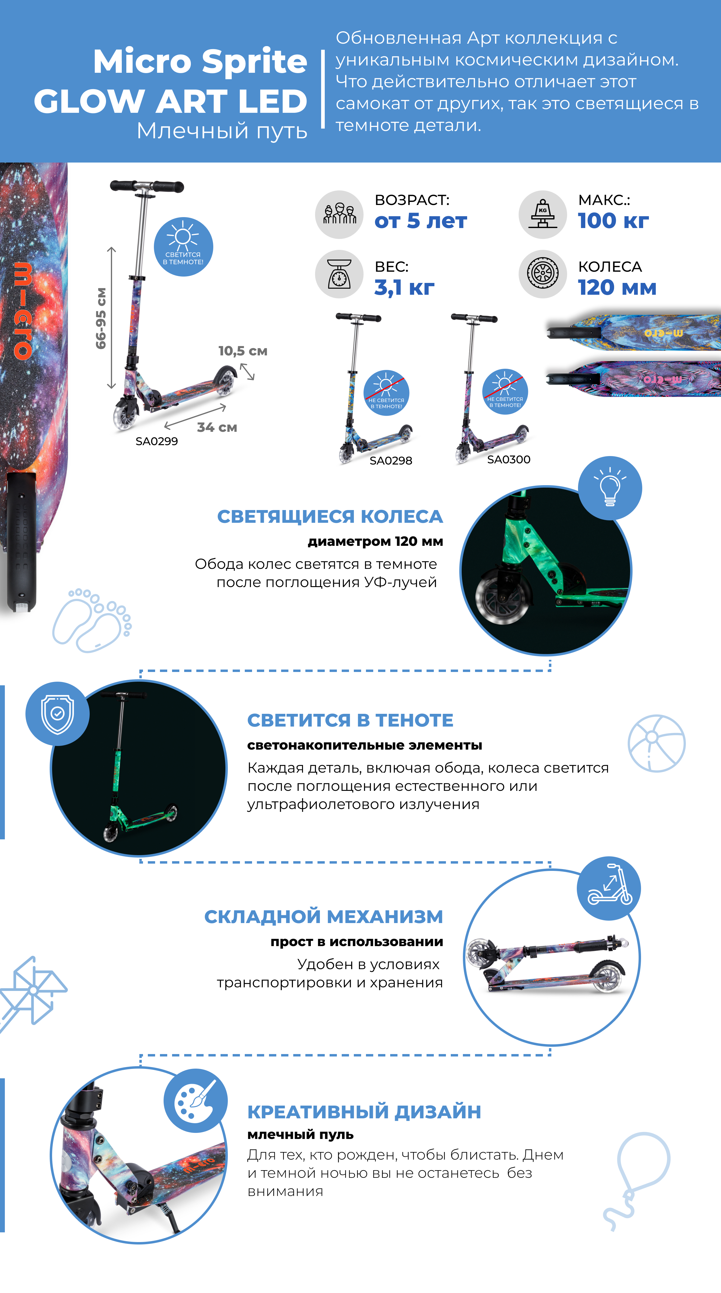 Двухколесный самокат Sprite Glow LED, Art Млечный путь со светящимися колёсами от известного швейцарского бренда Micro.