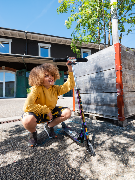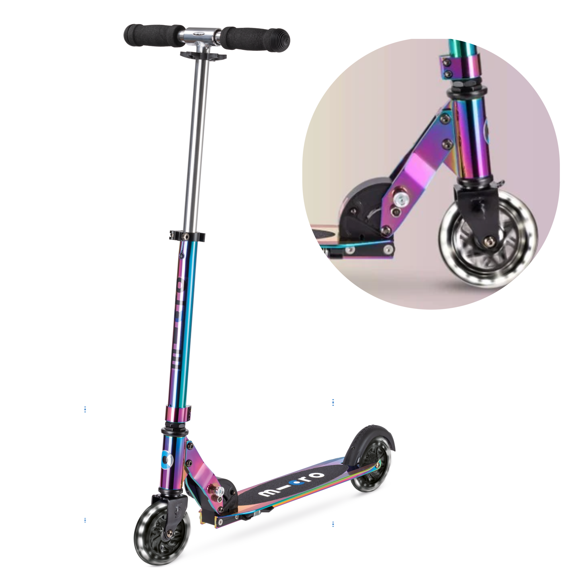 Двухколесный самокат Sprite Неохром со светящимися колёсами от известного швейцарского бренда Micro. Облегченный вариант самоката для детей от 5 лет.