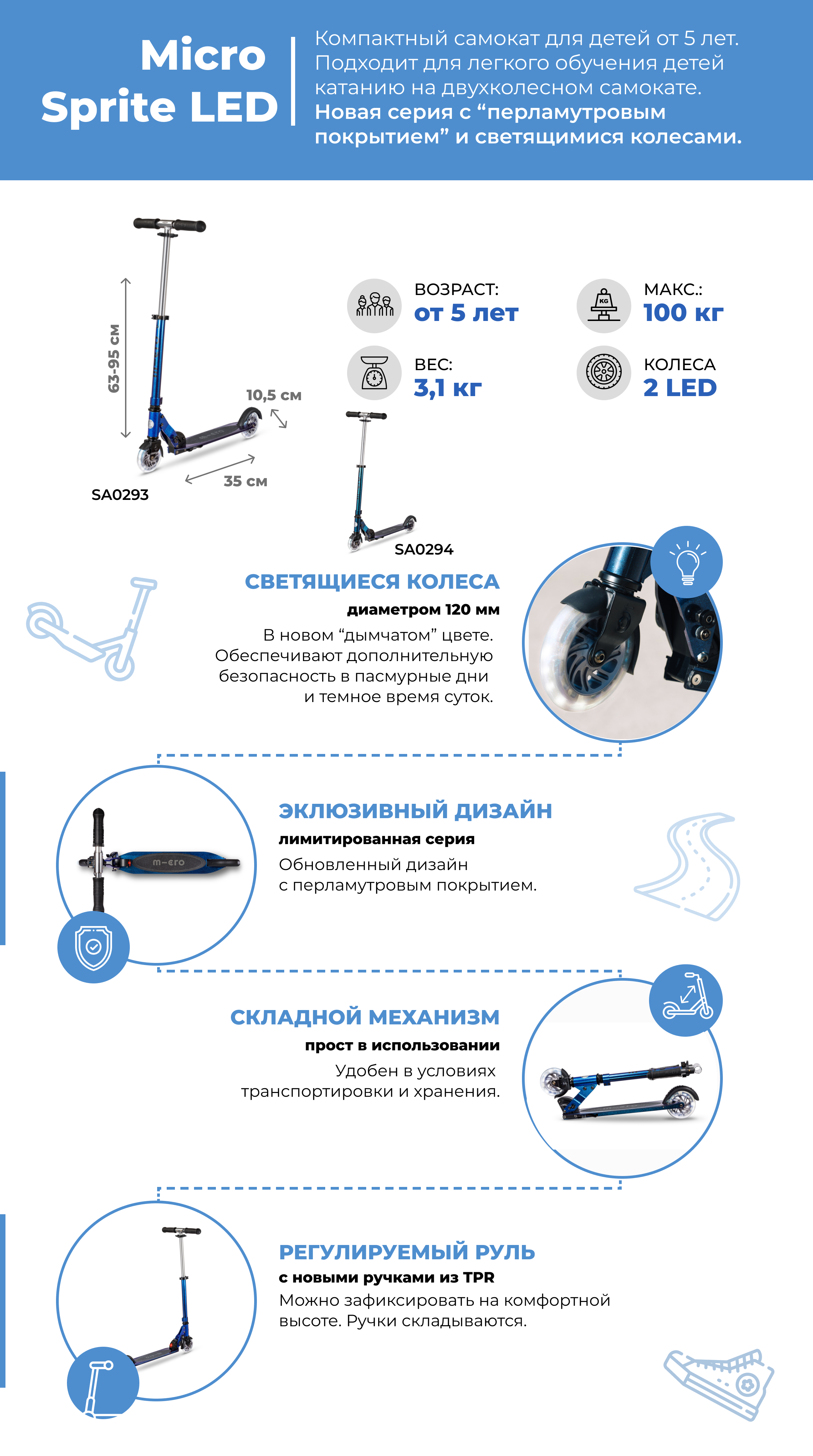 Самокат обеспечивает дополнительную безопасность в пасмурные дни и темное время суток! Испытайте вау-эффект с помощью специальных блестящих светодиодных колес!