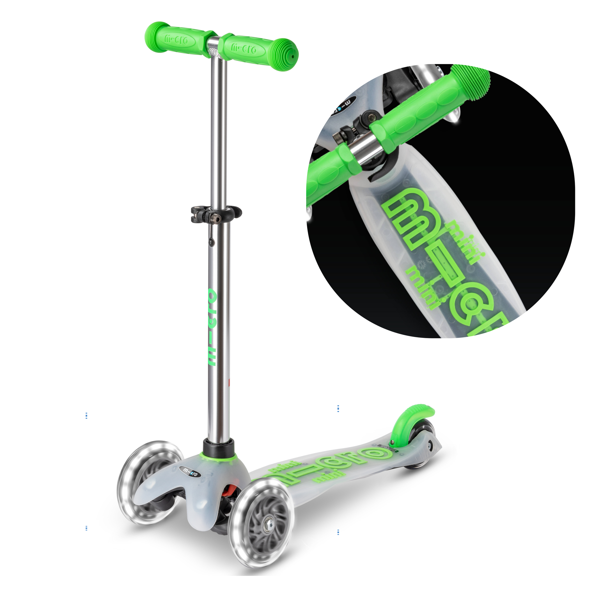 Детский самокат Mini Deluxe Flux LED неоновый зеленый со светящимися колёсами от известного швейцарского бренда Micro. Модель в серии Mini Micro Deluxe помогает учиться держать баланс и развивает у ребенка координацию движения. Разработан специально для детей от 2-х до 5-ти лет. Mini Micro Deluxe теперь с новым прозрачным дизайном платформы, алюминиевой стойкой руля и светящимися колёсами.