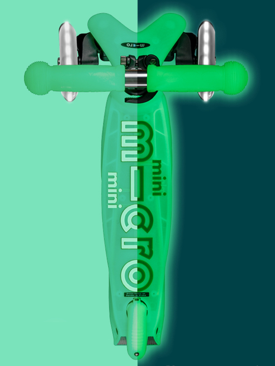Детский самокат Mini Deluxe Glow (светящийся) LED ледяной лайм от известного швейцарского бренда Micro. Разработан специально для детей от 2-х до 5-ти лет.