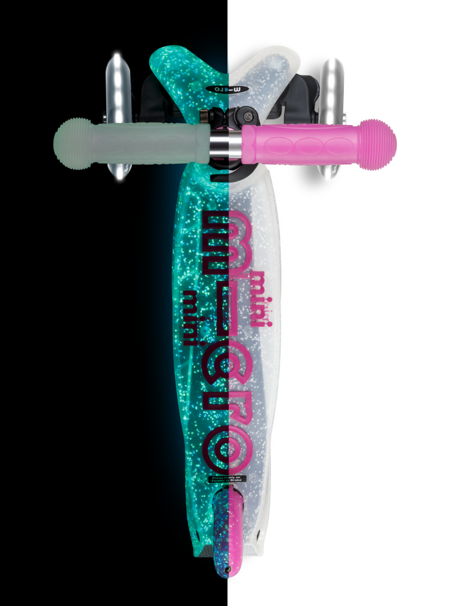 Его уникальность в том, что самокат оживает в темноте: дека и тормоз украшены звездочками, которые заряжаются при солнечном свете или искусственном ультрафиолетовом излучении и светятся в темноте. Сверкающие элементы придают самокату очаровательное сияние, и все это без батареек. Кроме того, руль с искрящимся эффектом придает ему яркую изюминку.