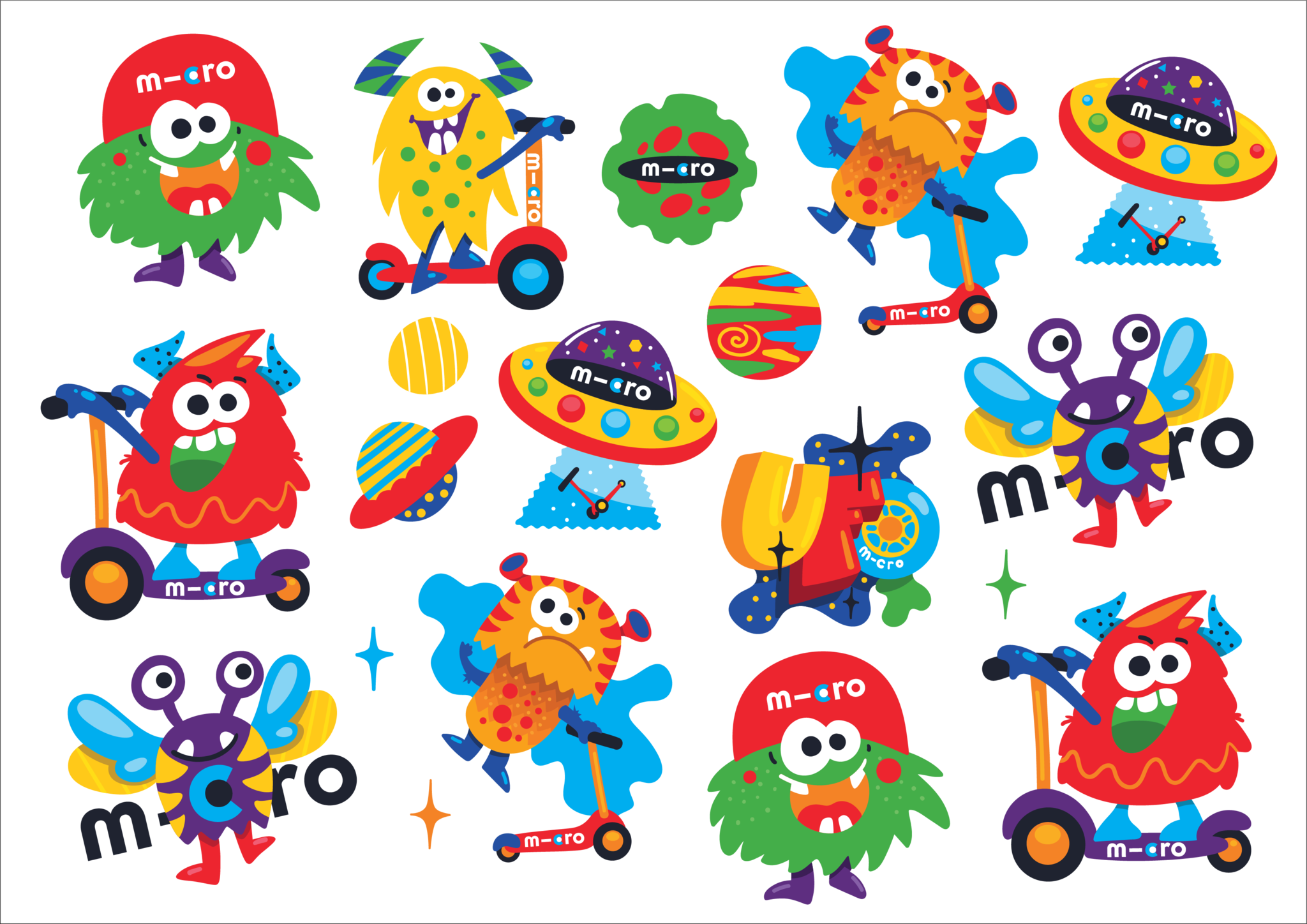 Стикерпак Монстрики на самокат, беговел и шлем от известного швейцарского бренда Micro.